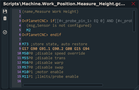 Script file will open in TNG gcode editor. In order that Work Position/Measure Height script file is generated and saved in your profiles Script folder, you need to click Save button.