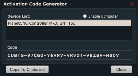 You will notice that option “Enable computer” is available. With this feature enabled you are able to select your computer from Device list and generate activation code. We do not accept these activation codes (KU…..).