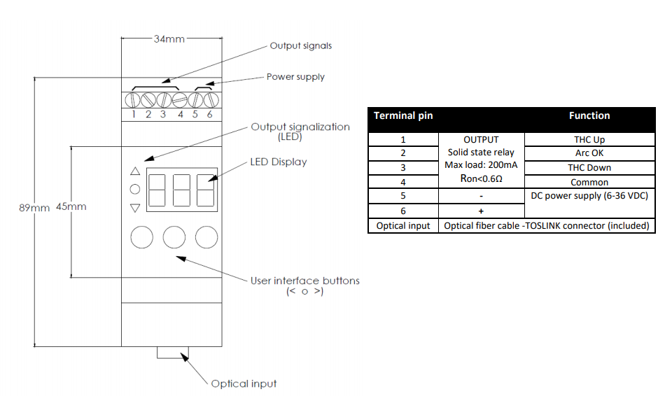 • Output signals: Arc Ok, Up and Down (normally-open solid-state relay outputs)