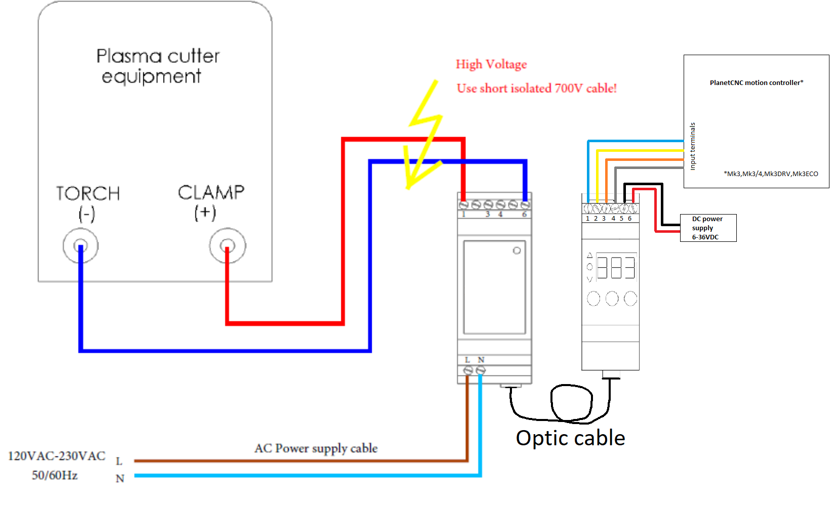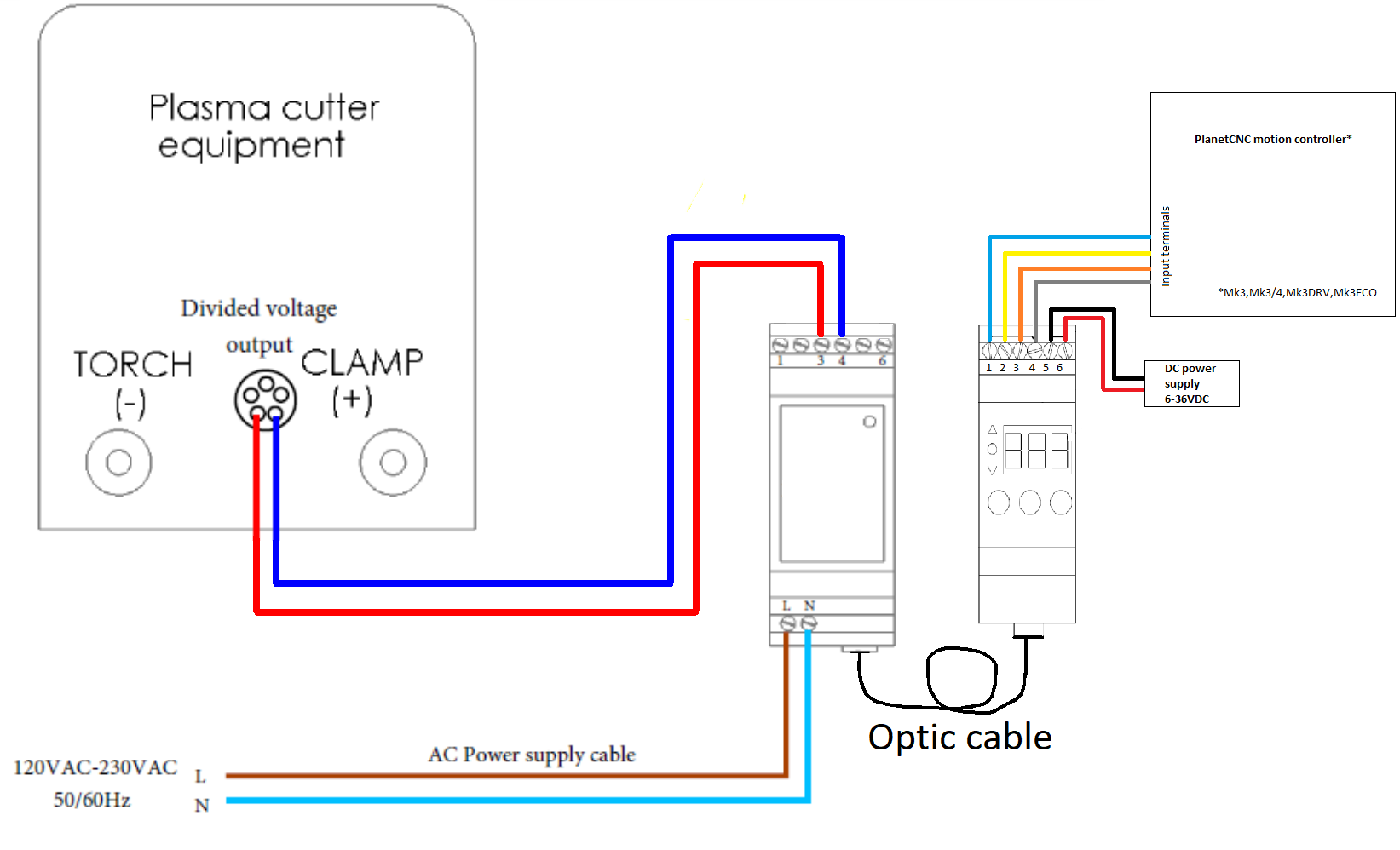 Please note that Down, Up, Arc OK signals can be connected to any input of PlanetCNC controller since inputs function can be configured later in PlanetCNC TNG settings.
