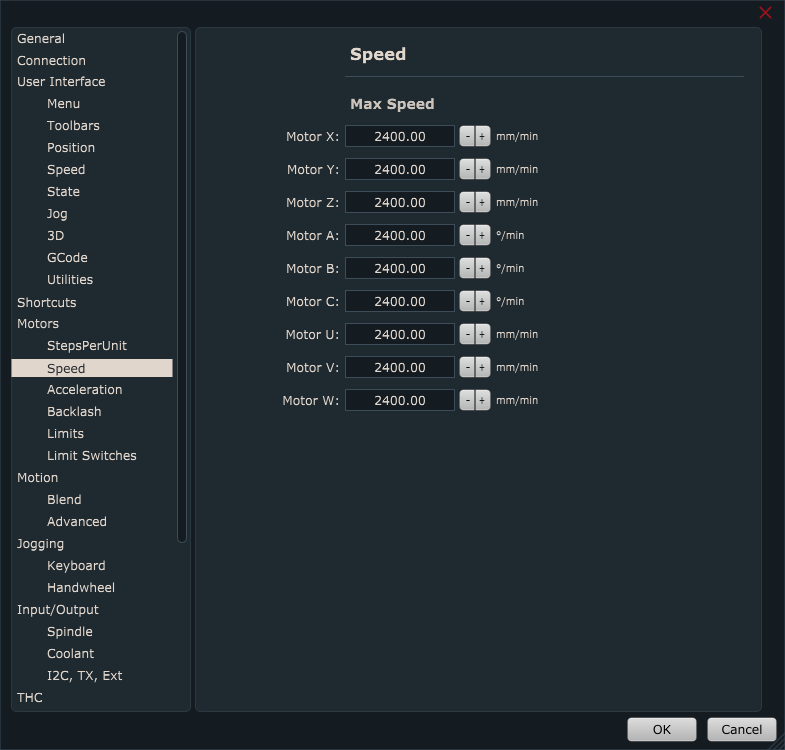File/Settings/Motors/Speed & Acceleration: