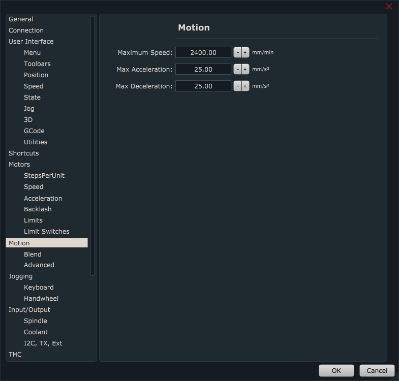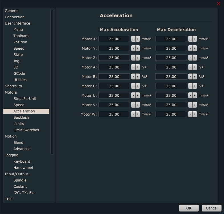 For standard 3 axis linear CNC machines, speed and acceleration values under Motors/Speed & Acceleration and Motion/ Speed & Acceleration are are usually the same.