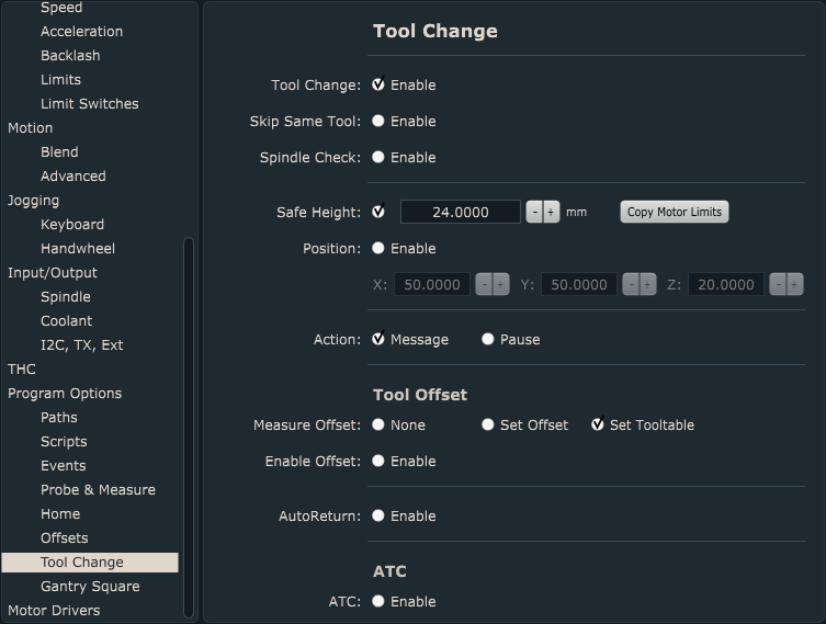 *Tool Change ATC group of settings will not be described and used in this tutorial. ATC configuration is described in depth in the PlanetCNC TNG user manual.