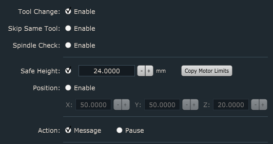 This value represents the machine Z axis value to which machine will ascend when tool change occurs. You enable it with a check on radio button. If Position is enabled, machine will travel to its XYZ position at Safe Height value.
