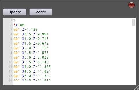 With “Verify” button you verify edited g-code in case of any errors. If error is located, message is displayed with error description and number of program line that causes error: